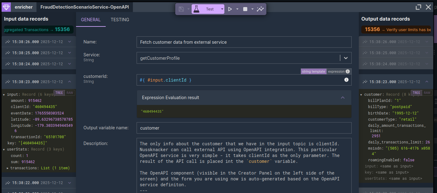 The example above is from the Real-Time Finance Fraud Detection demo scenario. The link will open an OpenAPI Enricher node of a deployed scenario; you can inspect content of data records as they enter and leave scenario. Close the node configuration window to return to the scenario alt="Nussknacker scenario diagram" .