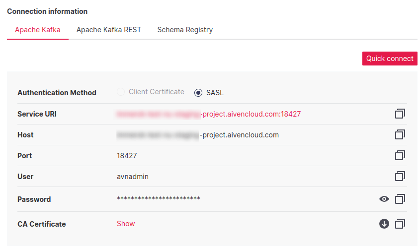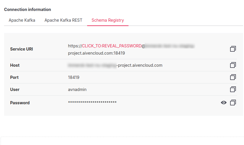 bootstrap.serversshould beService URIfrom Apache Kafka tabusernameshould beUser(avnadminby default) from Apache Kafka tabpasswordshould bePasswordfrom Apache Kafka tabschema.registry.urlshould containService URIfrom Schema Registry tab, without user and passwordbasic.auth.user.infoshould containUserandPasswordfrom Schema Registry tab, separated with:- Truststore: copy