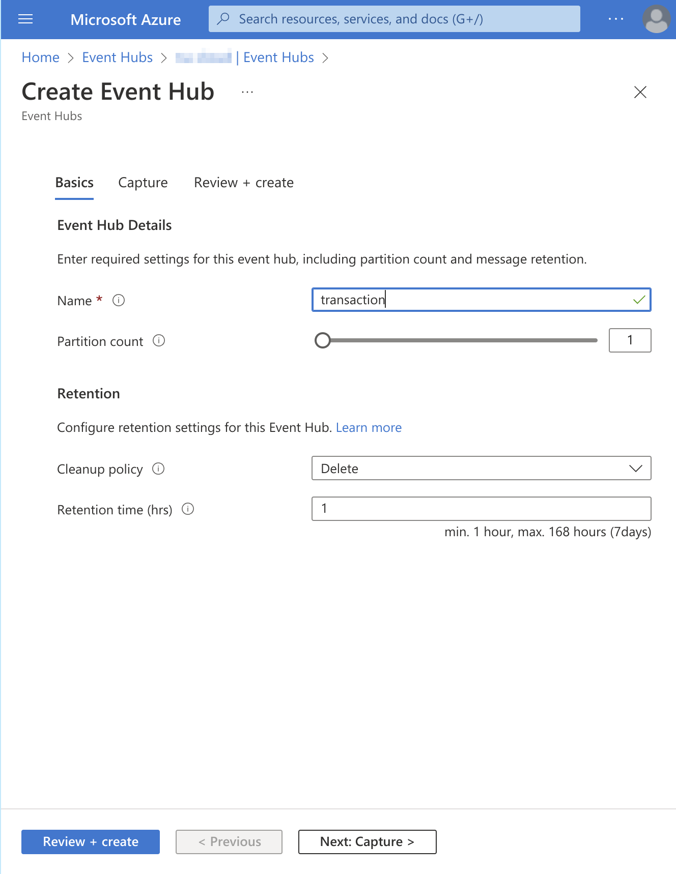 + Event Hubbutton - Set a name and optionally additional parameters like Partition count and Retention policy